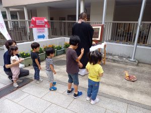 今年も雲龍寺住職と光明第五保育園の園児達が、手を合わせて一緒に迎え火を行いました。