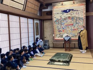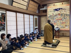 坐禅会の後、今月の教え「禅定静寂」の法話を行い、園児たちは保育園生活で礼儀ある落ち着いた生活を身に着ける大切さを学びました。